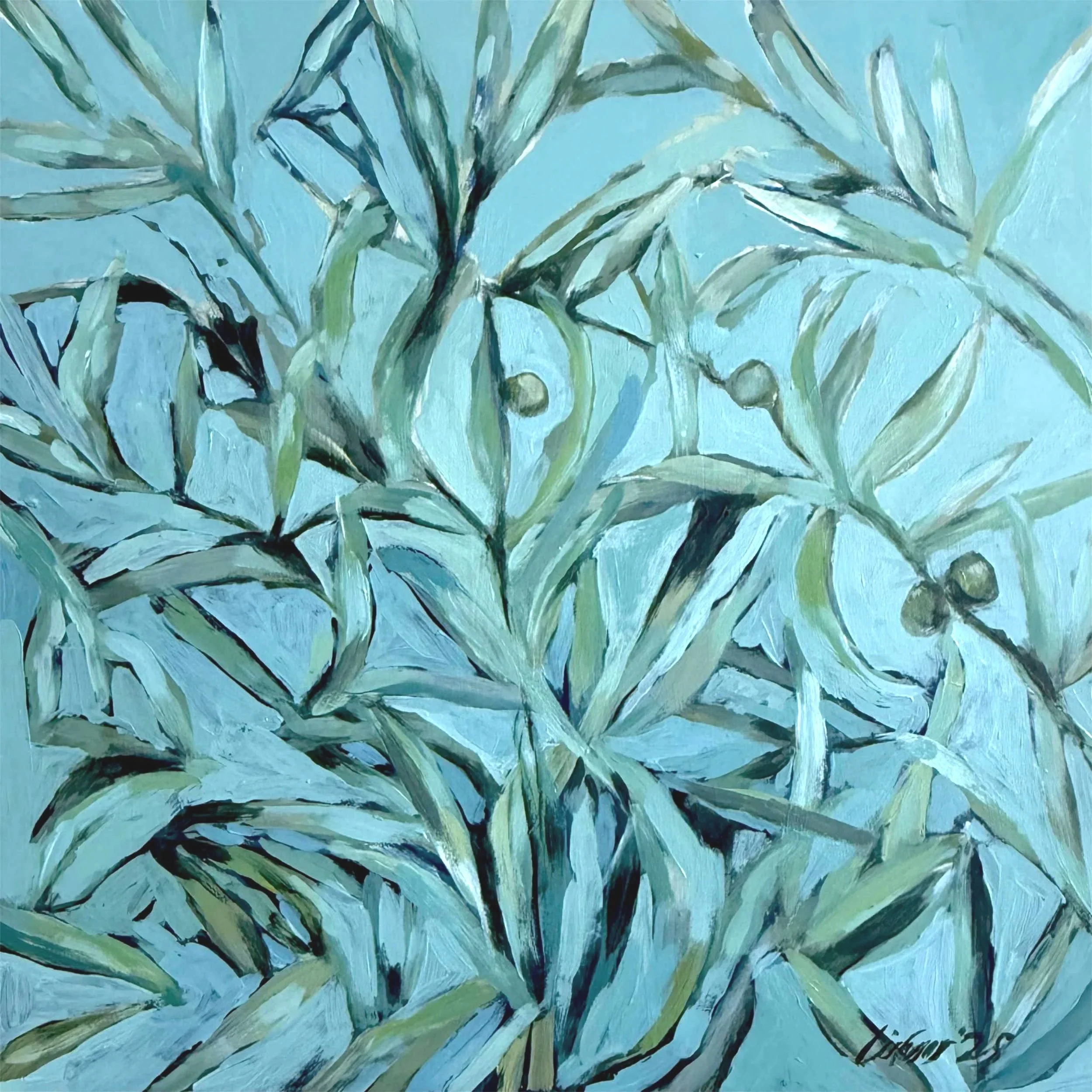 Picking Season is Round the Corner merges subject and background into a single, immersive composition. Using acrylic on canvas board, the artist uses a unified palette of cool teals and sage greens to weave the olive branches directly into the atmosphere, creating a sense of movement and abundance.