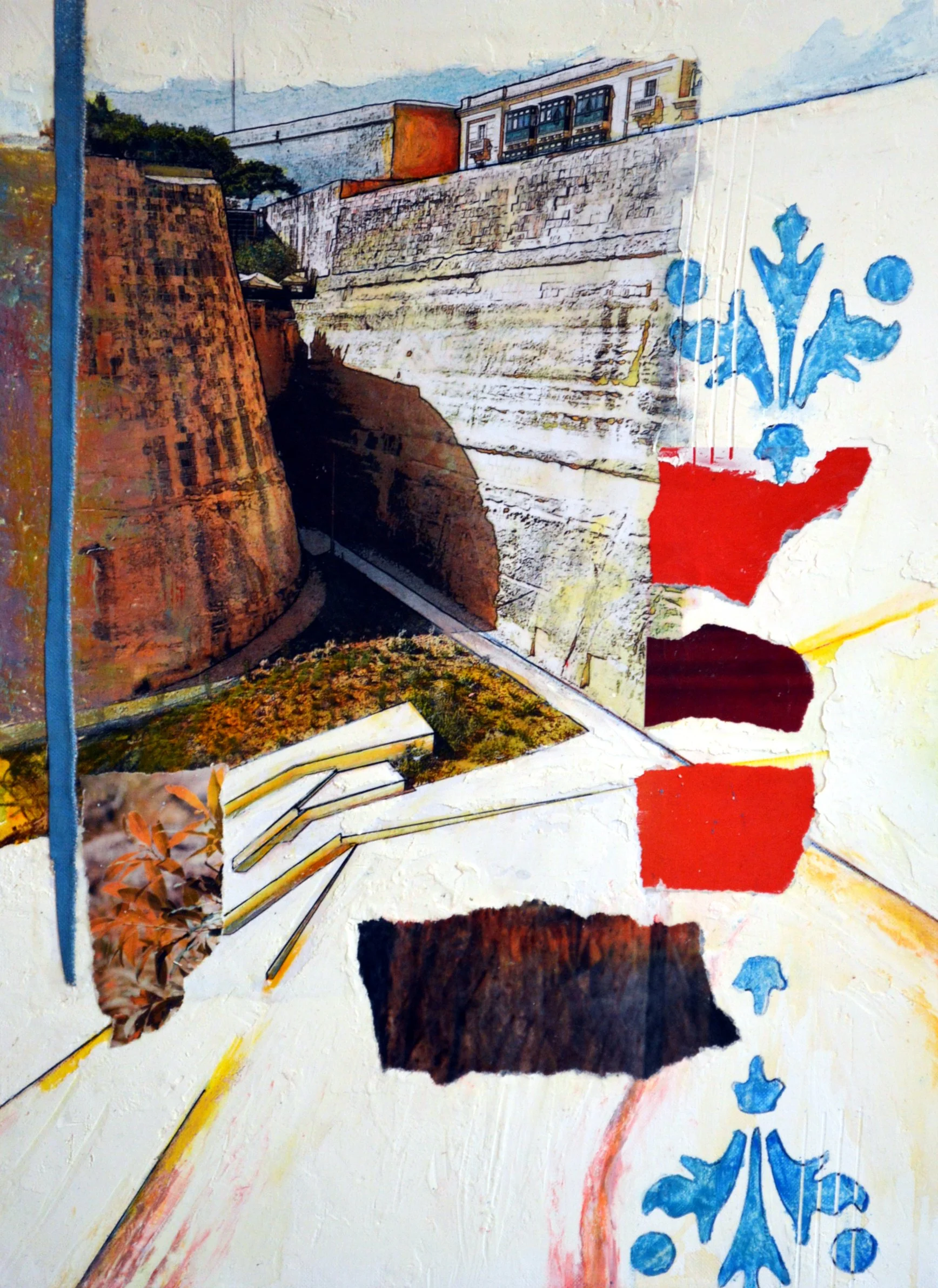 Built as a fortification, the enormous limestone walls of St. John’s Bastion - viewed from the bridge leading to the Maltese capital city of Valletta - are the focal point of this piece.