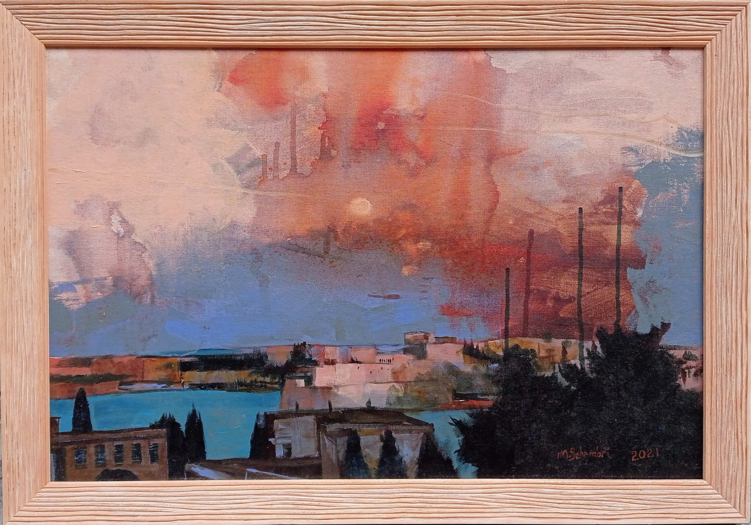 The artist observes the view of Fort St. Angelo and its surroundings from his window almost every day. He is captivated by how changes in the weather transform the mood of the entire panorama. In this painting, however, he allowed himself to be more imaginative, particularly in the depiction of the sky, where artistic expression takes precedence over realism. In the foreground, Boffa Hospital and a few trees along Harper Lane in Floriana complete the scene.