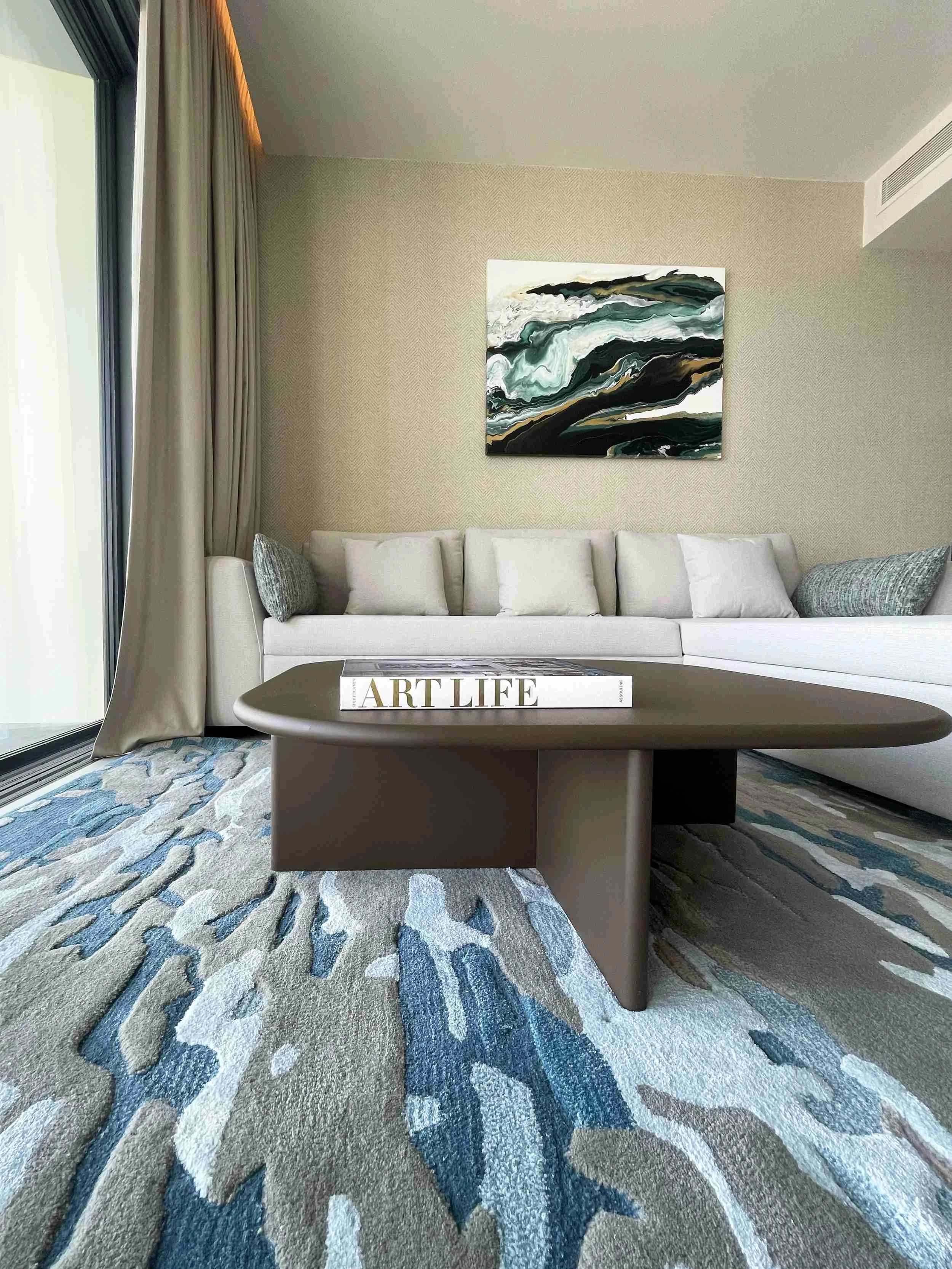 Chronos by Caryl Swale is part of the Temporal series, from the Meliá Collection. Caryl Swale was commissioned by Allura for a project for Meliá Hotels International to create a collection of 47 original abstract artworks for ME Malta Hotel at Mercury Tower. Working on site alongside a second artist Laura Swale, the two designed and produced paintings for hotel rooms and residences. A fluid, organic aesthetic was employed to resonate with the panoramic coastal scenery outside, connecting residents visually and viscerally to the timelessness of nature, while complementing the design, decor and vantage points of each individual space.